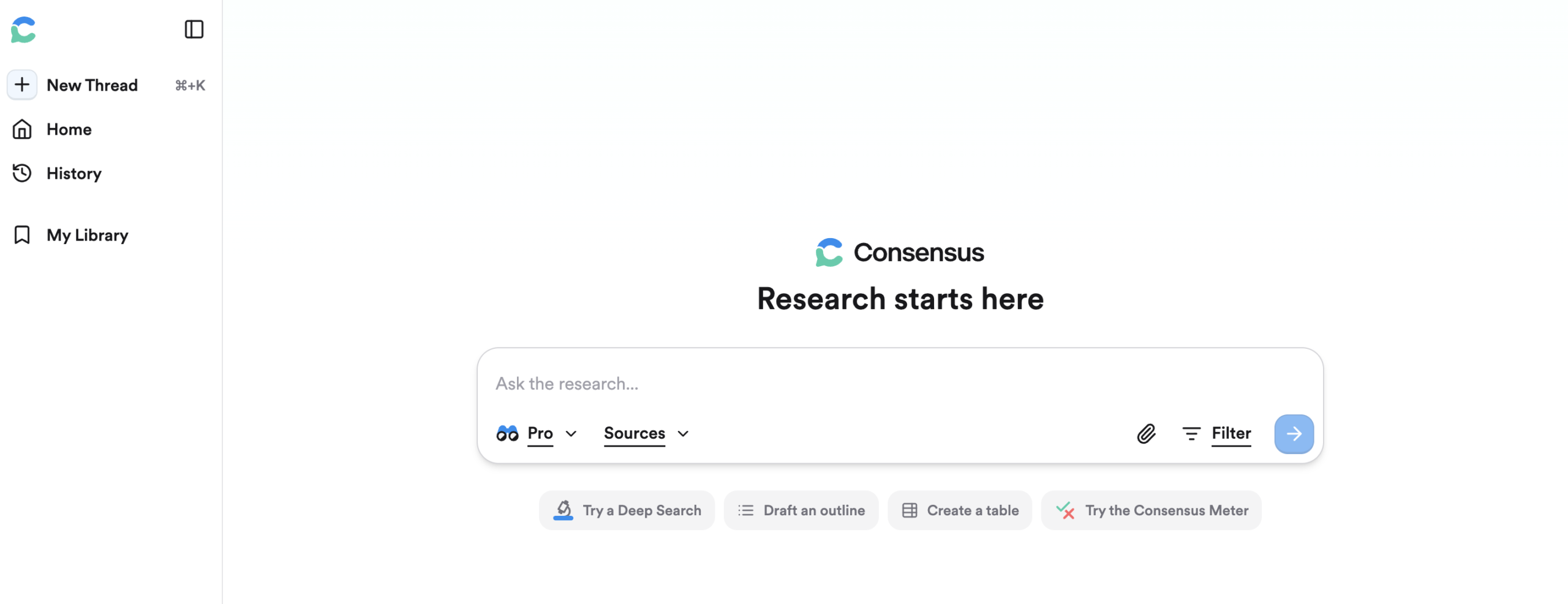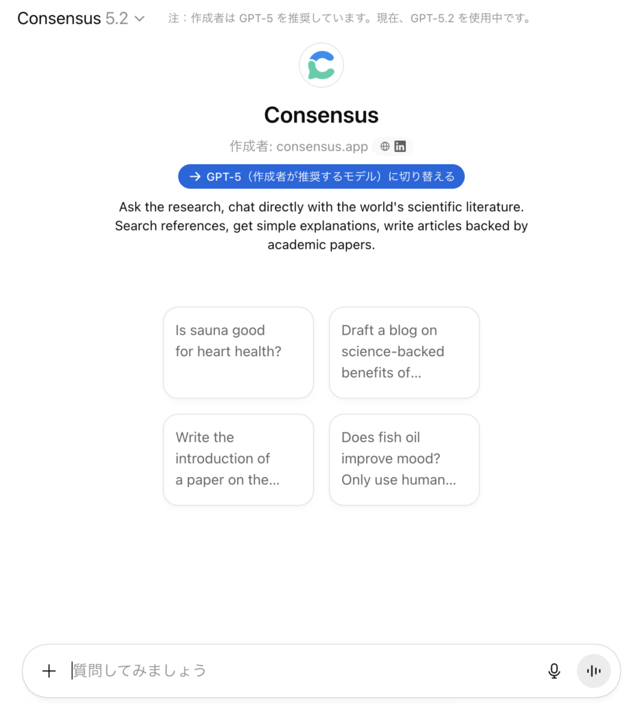選択後に 「チャットを開始」 をクリックすると、Consensusとの対話セッションが開始します。