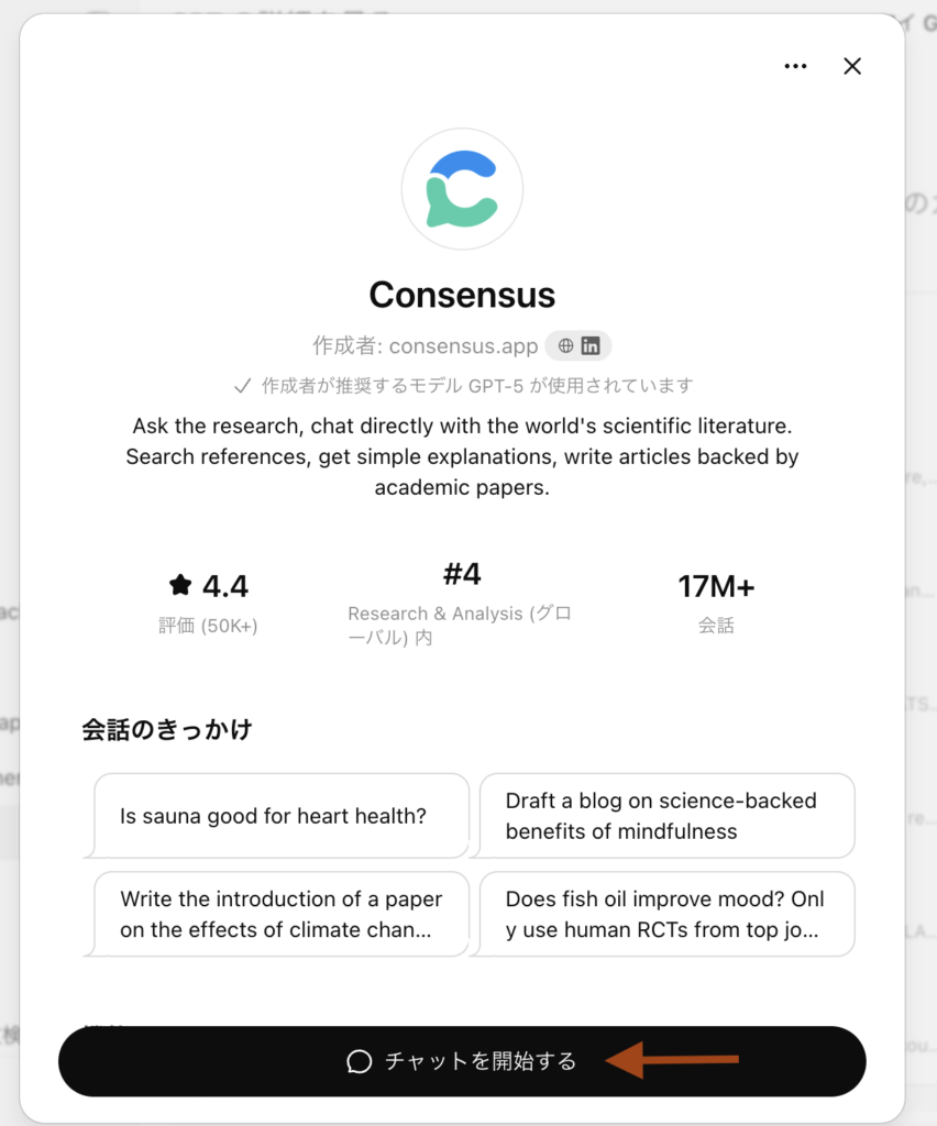 GPT一覧の検索窓に Consensus と入力すると、該当するGPTsが候補として一覧に出ます。
