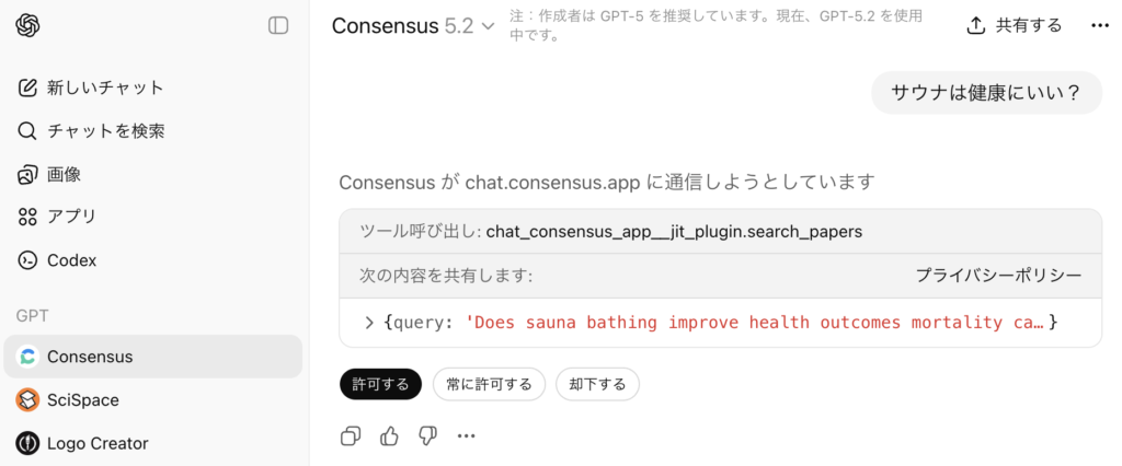 このように、ChatGPTがConsensusにアクセスし、「このクエリで検索しますよ」と赤字で教えてくれるので、「許可する」ボタンを押します。